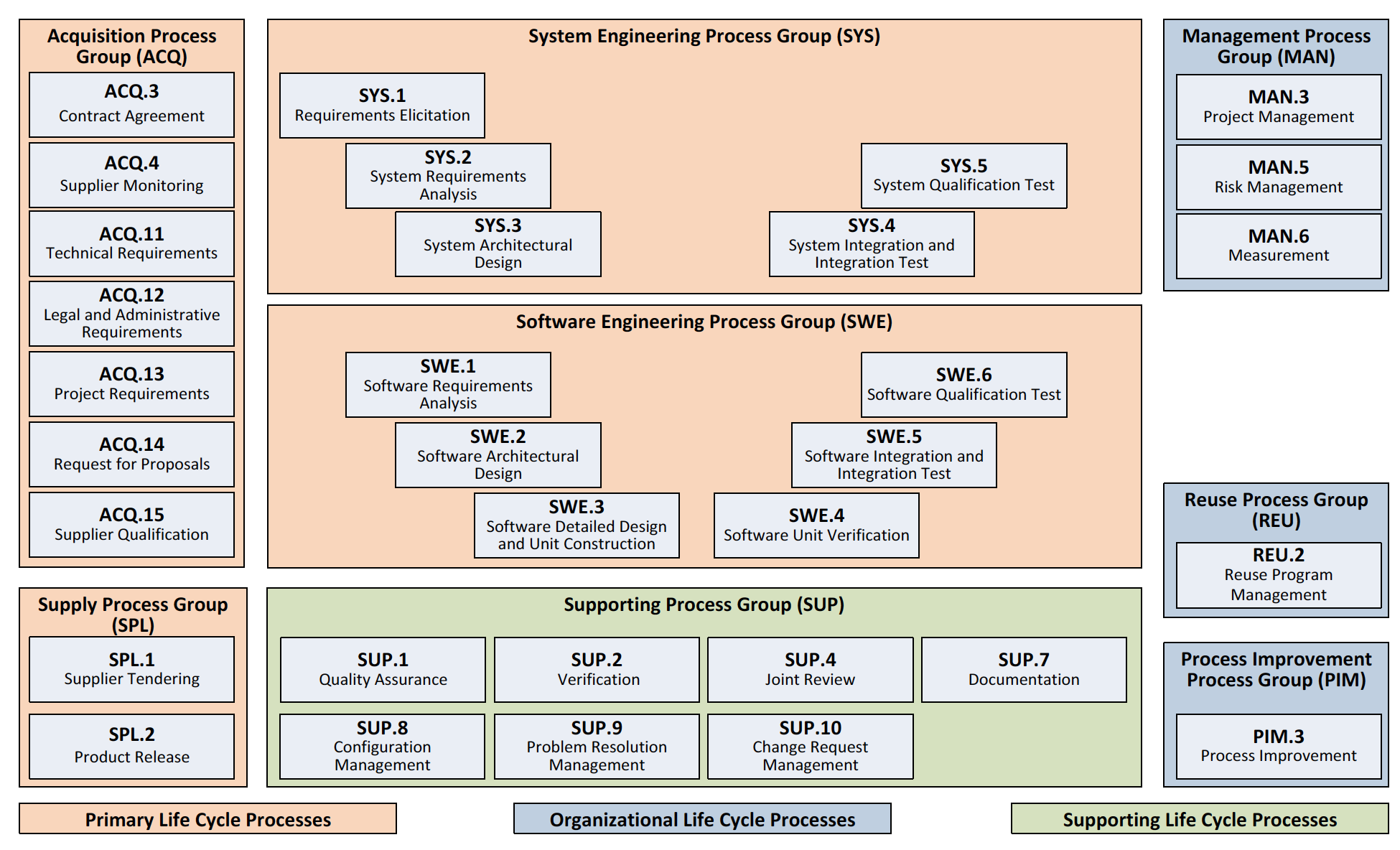 【2010年V3.0】2010对ASPICE做了一些结构上的修订,包括将PRM和PAM合二为一、将ENG工程过程组拆分为SYS系统工程组和SWE软件工程组、五级名称变化等。